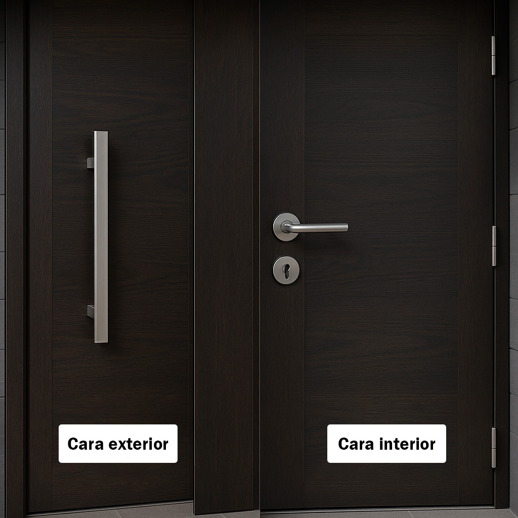 Esto ocurre principalmente en las puertas de entrada o en accesos exteriores, donde por el interior se coloca una manilla, pero por el exterior puede haber un tirador, bocallave o pomo fijo.